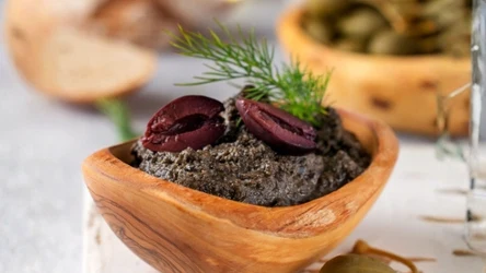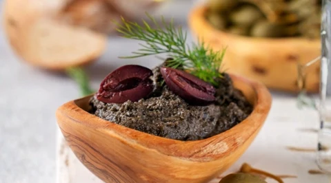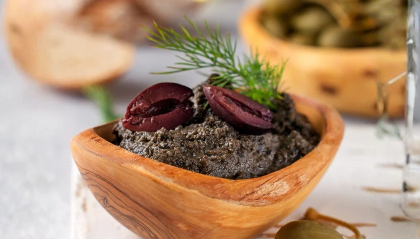 Śródziemnomorska pasta z czarnych oliwek. Idealnie pasuje do pieczywa