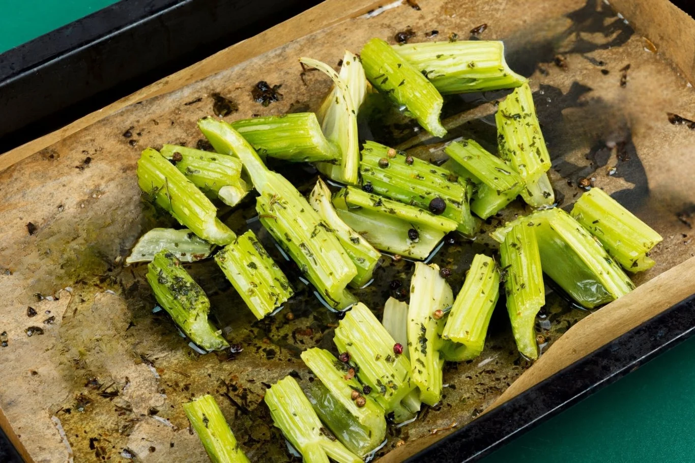 W głębokiej misce wymieszaj oliwę z przyprawami. Wrzuć seler i dokładnie obtocz w marynacie.