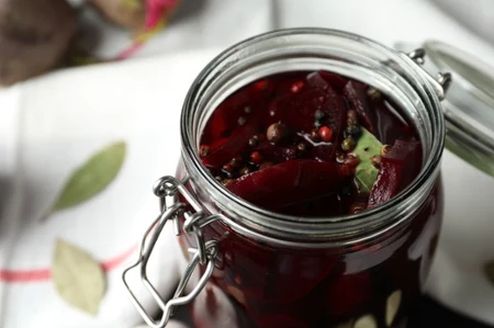 - W wyparzonym słoju układaj buraki warstwowo, przekładając je czosnkiem, cebulą i przyprawami.