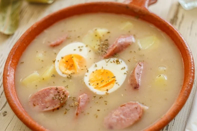 A co z żurkiem? Wiele osób dzisiaj myli żurek z barszczem białym, gdyż uważa się, że obie zupy powstają z zakwasu pszennego. To jednak nieprawda. Rzeczywiście żurek jest gotowany na zakwaszonej mące żytniej, jest lżejszy od żuru i pełen zapachu i smaku majeranku. Najczęściej zabielany, podawany z kiełbasą białą oraz jajkiem - inaczej niż żur.