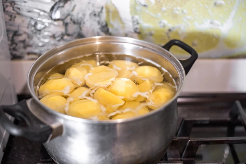 Chyba każdy chociaż raz, na pytanie" "Kiedy będzie obiad?", odpowiedział stwierdzeniem, "Jak ziemniaki się ugotują.". Jeśli chcesz przyspieszyć proces gotowania ziemniaków, po obraniu pokrój je na mniejsze kawałki, dzięki czemu szybciej będą miękkie. Zamiast czekać, aż woda się zagotuje, możesz użyć wrzątku z czajnika. Innym sprytnym patentem będzie dodanie do gotującej się wody odrobiny masła - łyżeczka z zupełnością wystarczy.