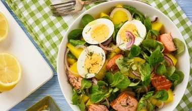 Piekę łososia, gotuję ziemniaki i jajka. Ta sałatka to witaminowa bomba, pomaga schudnąć