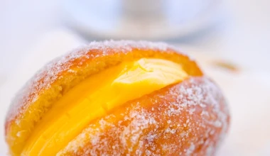 Portugalski pączek wypełniony kremem po brzegi. Rozpływa się w ustach jak puch