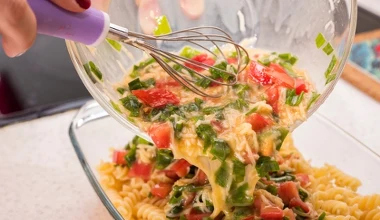 Wlej rozbełtane jajka do makaronu z warzywami. Zrobisz obłędną zapiekankę na obiad
