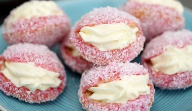 Różowe ciasteczka ze śmietanowym nadzieniem. Przepis na słodkie Buziaczki