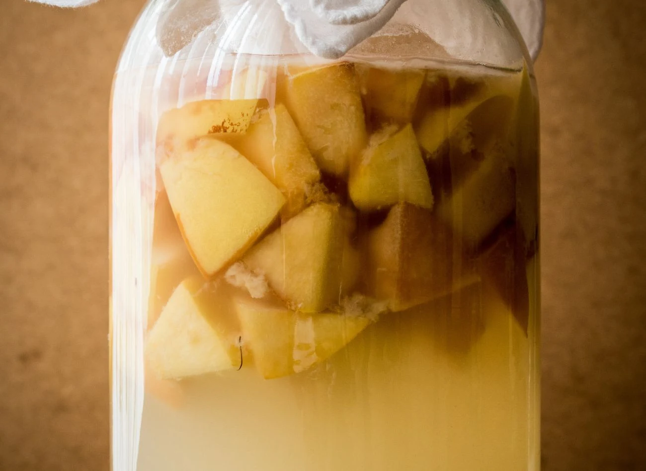 - Zalej owoce wodą tak, aby były całkowicie zakryte. Dodaj cukier lub miód, a także matkę octową lub kilka łyżek octu owocowego.