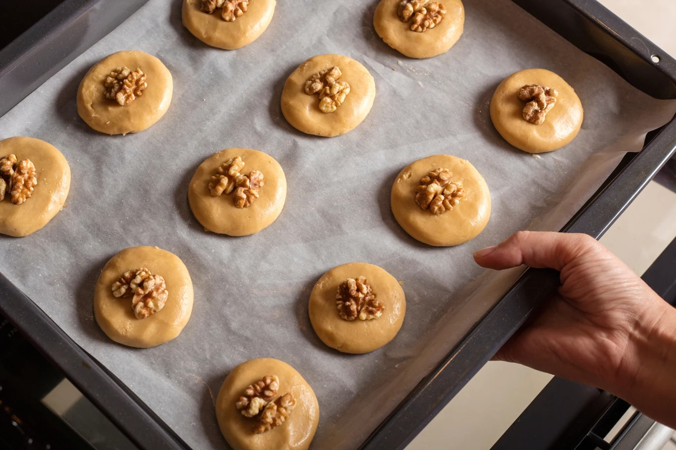 Odrywaj niewielkie kawałki ciasta i formuj kulki wielkości orzecha włoskiego. Układaj je na blasze wyłożonej papierem do pieczenia i lekko spłaszczaj. Na każdym ciasteczku ułóż połówkę orzecha.