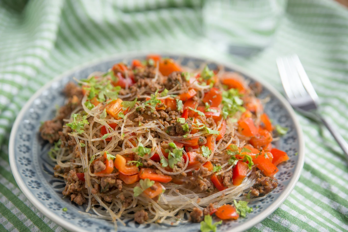 Makaron sojowy z warzywami i wołowiną nawiązuje do aromatycznych smaków Azji w lekkiej, odświeżającej odsłonie. Makaron sojowy, znany ze swojej delikatności, doskonale komponuje się z aromatycznym mięsem i świeżymi warzywami. Dodatek papryczki chili nadaje potrawie nuty pikantnego aromatu, a kolendra i trawy cytrynowej świeżości.