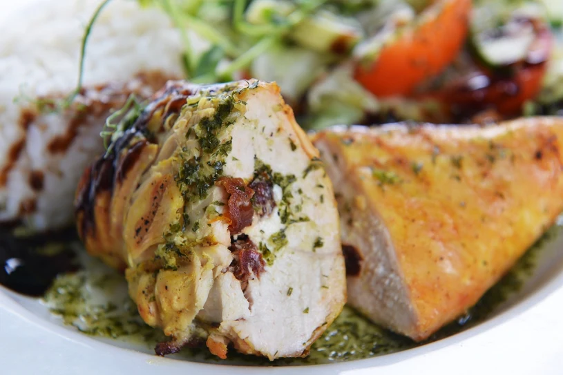 Kurczak w sosie bazyliowym to soczyste roladki faszerowane nadzieniem w stylu śródziemnomorskim. Farsz to suszone pomidory, mozzarella i czosnek. Całość zwieńcza prosty, kremowy sos na bazie śmietanki i bulionu, w którym oczywiście najważniejszym składnikiem są świeże listki bazylii. Ta smakowita potrawa sprawdzi się idealnie na rodzinne uroczystości.