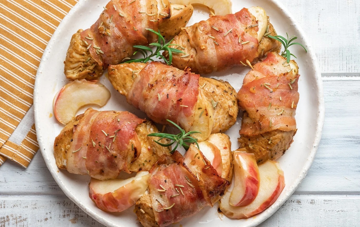 Po kilku minutach zdejmij cząstki jabłka z patelni i obłóż nim każdy kawałek kurczaka. Następnie ciasno owiń mięso plastrami boczku i zepnij wykałaczkami.