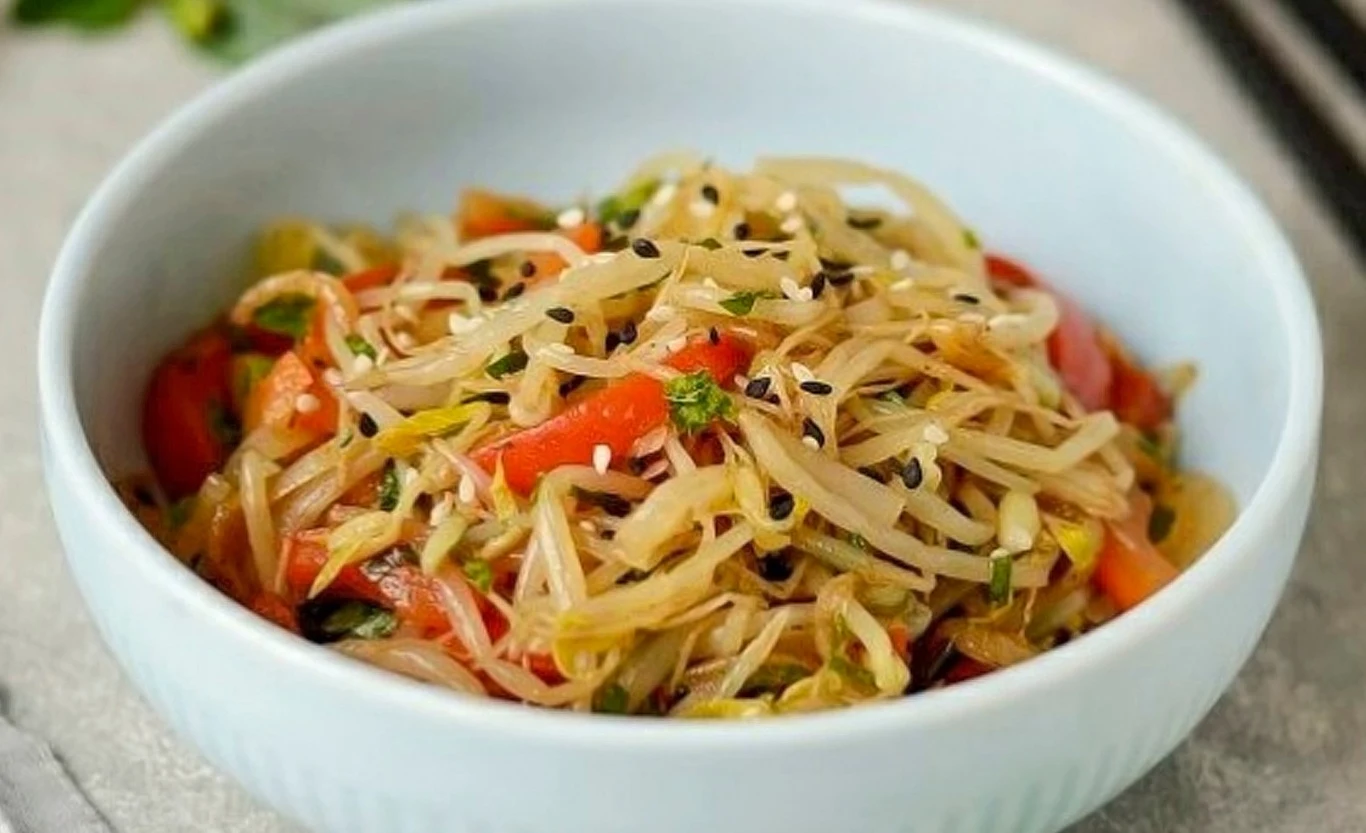 Surówka z kiełkami fasoli to zestawienie świeżych warzyw, wyrazistego sosu sojowo-sezamowego i cytrusowego aromatu liści kaffiru. Taki dodatek potrafi całkowicie zmienić charakter obiadu.