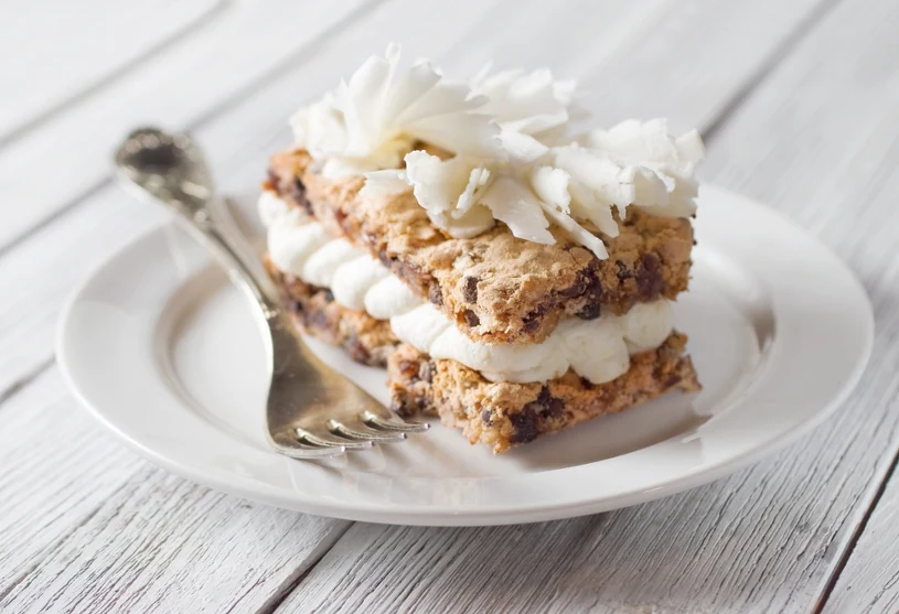 Przejdź do złożenia deseru. Na każdy prostokąt ciasta wyciskaj porcję kremu, przykrywaj drugim ciastkiem, a wierzch posmaruj małą porcją kremu i udekoruj wiórkami z białej czekolady. Przełóż Przystojniaka do lodówki do schłodzenia. Podawaj zawsze schłodzony.