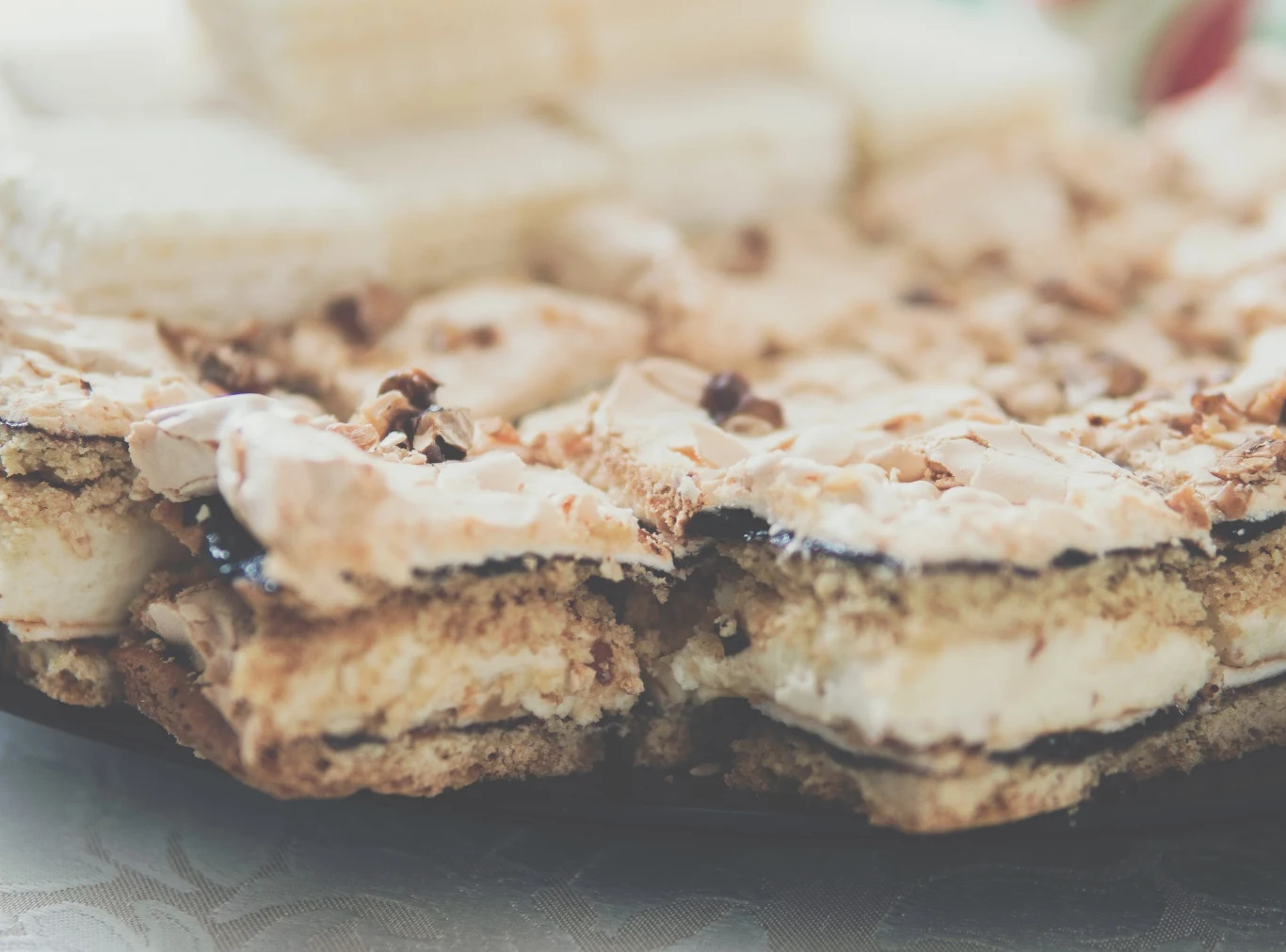 Na górę bezy wysyp po 200 g posiekanych orzechów włoskich i po 200 g rodzynek.