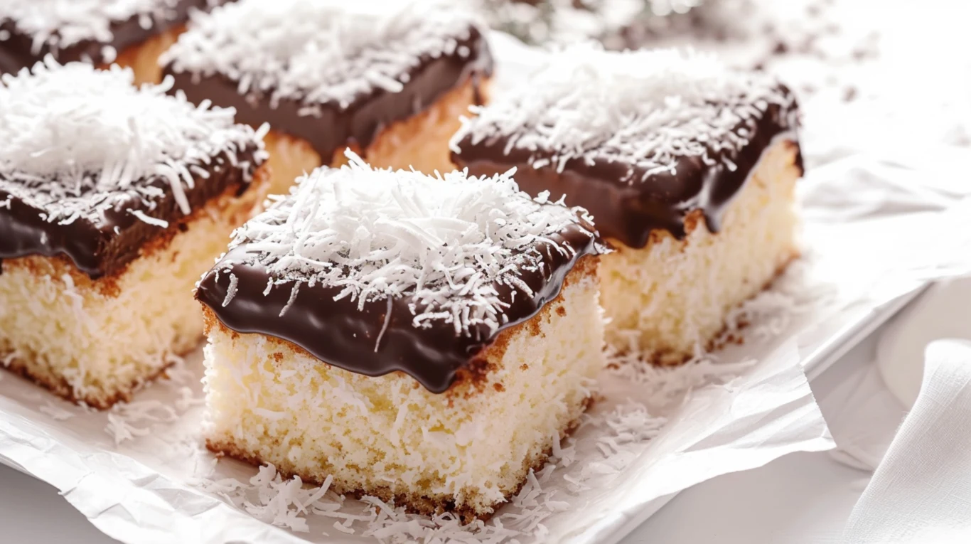 Przygotuj wierzch. Wymieszaj w misce: cukier, kakao i pokruszoną czekoladę. Następnie zalej wrzącą wodą i energicznie wymieszaj do uzyskania gładkiego sosu. Jeśli będzie on zbyt gęsty, dodawaj po łyżce wody do uzyskania odpowiedniej konsystencji. Wiórki kokosowe wysyp do głębokiego talerza. Kostki ciasta obtaczaj w wiórkach kokosowych i odkładaj na talerz lub paterę. Na wierzch każdej wylej po 1-2 łyżki sosu czekoladowego i posyp obficie wiórkami.