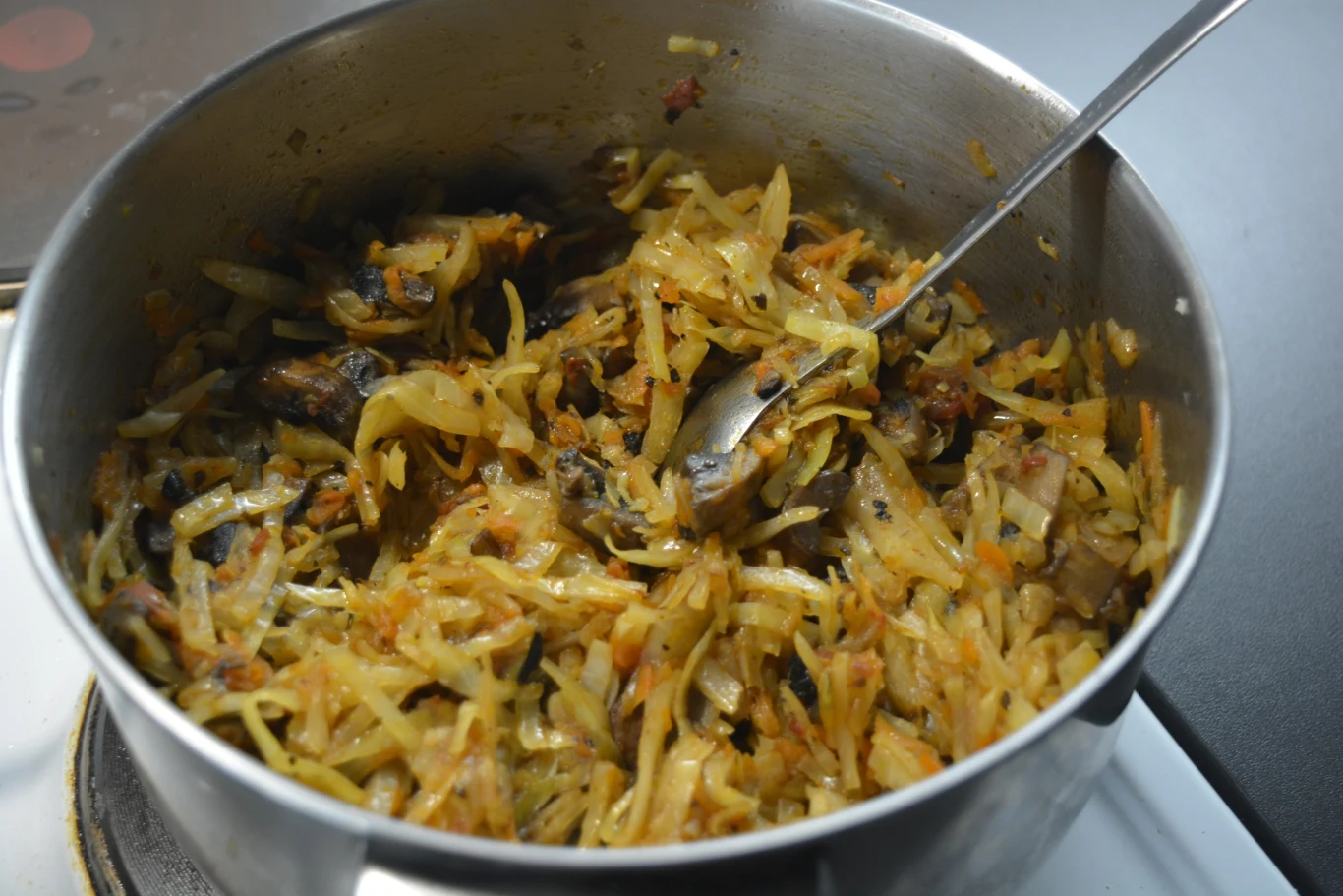 Grzyby namocz w ciepłej przegotowanej wodzie. Pokrój je na mniejsze kawałki. Kapustę umyj pod bieżącą wodą i dokładnie osusz. Odetnij liście z zewnątrz i twarde części. Pokrój na mniejsze części, aby łatwiej się kroiło. Następnie poszatkuj kapustę bardzo drobno. Wrzuć ją do garnka i zalej, aby woda tylko ją zakryła. Przełóż też grzyby wraz z kilkoma łyżkami wody, w której się moczyły. Dodaj ziela angielskie, jałowiec, liście laurowe, posól dość mocno i dodaj pieprz. Zagotuj, zmniejsz ogień i zostaw tak.