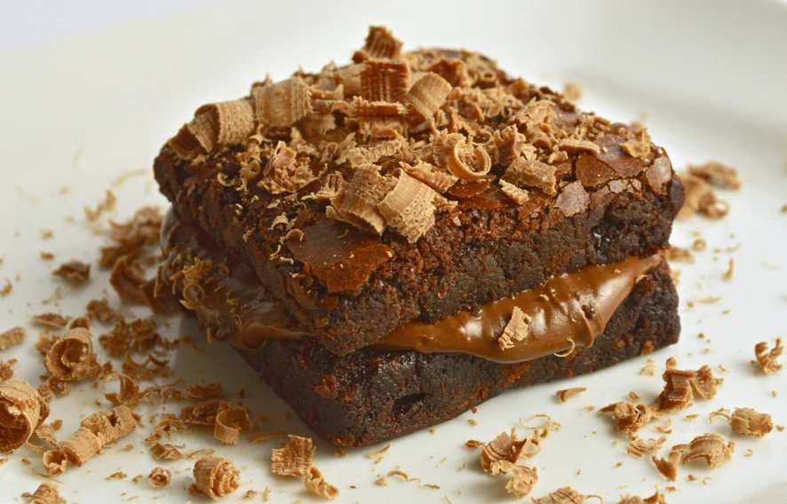 Brownie z kremem czekoladowym posyp wiórkami czekoladowymi. Podawaj od razu lub po schłodzeniu w lodówce.