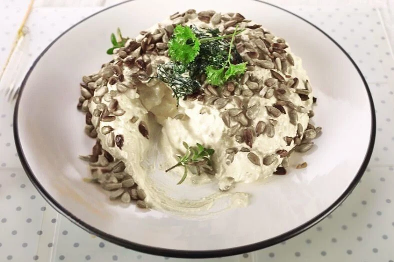 Gotowy twarożek ze słonecznikiem podawaj z ciemnym pieczywem na zakwasie oraz porcją świeżych warzyw, dobrze sprawdzi się rzodkiewka lub zielony ogórek.