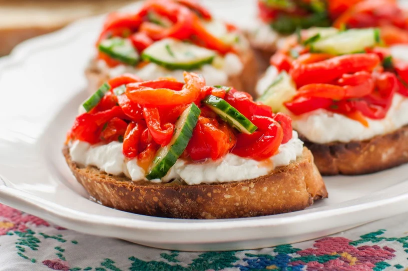 Przekąska z pieczonej papryki to doskonała propozycja na lekką kolację lub elegancką przystawkę podczas spotkania ze znajomymi. Pieczona papryka w połączeniu z chrupiącym ogórkiem, świeżą zieleniną i aromatycznym dressingiem tworzy smak, który przyjemnie orzeźwia. Całość podana na grzance z oliwą i serkiem typu philadelphia jest delikatna, kremowa i soczysta.