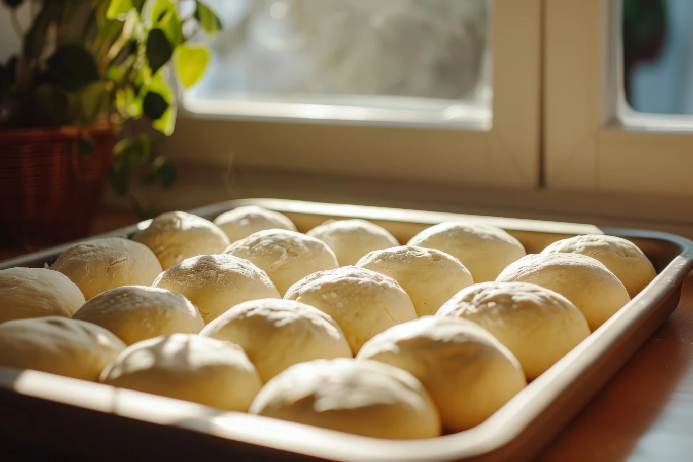 Z ciasta uformuj 12 równych kulek i umieść je obok siebie w naczyniu do pieczenia o wymiarach ok. 35x25 cm. Odstaw całość na 10 minut.