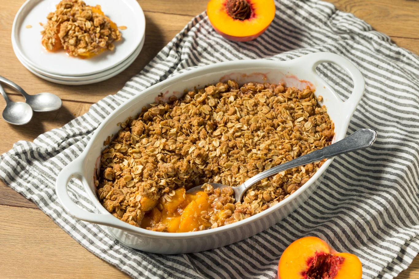 Soczyste, pachnące słońcem brzoskwinie to idealna baza do prostych, domowych deserów. Upieczone z dodatkiem kruszonki stają się jeszcze słodsze i bardziej aromatyczne, a ciepłe owoce doskonale kontrastują z chrupiącym wierzchem. Zawarty w kruszonce tłuszcz ułatwi wchłaniania beta-karotenu, wspomagając nasz wzrok i wygląd skóry.