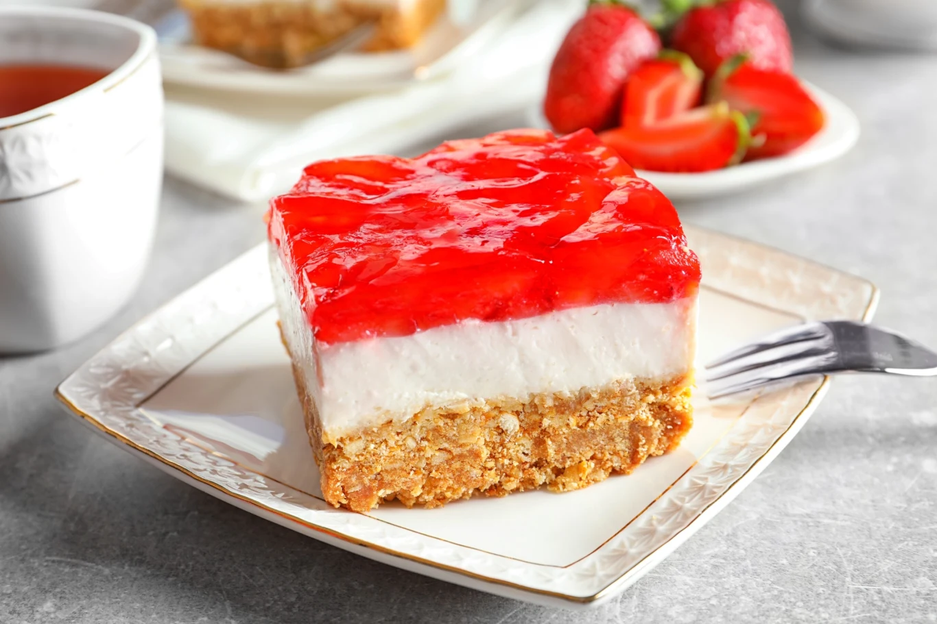 - Wyłóż masę śmietanową na spód i przełóż do lodówki. W tym czasie rozpuść galaretkę w gorącej wodzie i odstaw. Kiedy będzie tężeć, przełóż ją na ciasto i ponownie wstaw całość do lodówki.