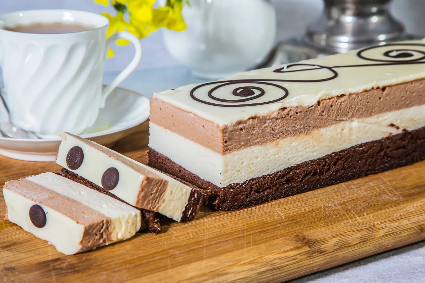 Cappuccino to połączenie pojedynczego espresso z mlekiem i mleczną pianką. Smak kawy jest tu wyczuwalny, ale nie tak bardzo jak na przykład w espresso. Aromat napoju świetnie odwzorowuje ciasto Cappuccino, które składa się z trzech różnych i pysznych warstw. Jedna z nich jest kawowa, druga czekoladowa, a trzecia śmietankowa. Nie może też zabraknąć polewy z białej i ciemnej czekolady. Całość wychodzi więc kawowa, ale przełamana śmietankowo-mlecznym posmakiem. Zupełnie jak ulubiony napój w kawiarni. Ciasto Cappuccino jest lekkie, puszyste i dosłownie rozpływa się w ustach.