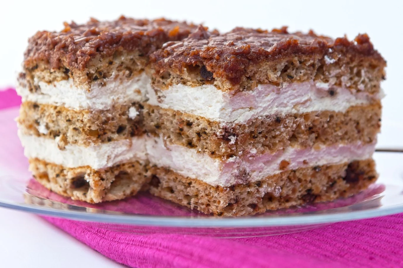 5. Złóż ciasto. Jeden blat ciasta włóż ponownie do formy. Wyłóż 1/2 kremu śmietankowego i przykryj drugim blatem. Powtórz warstwę kremu i ciasta.