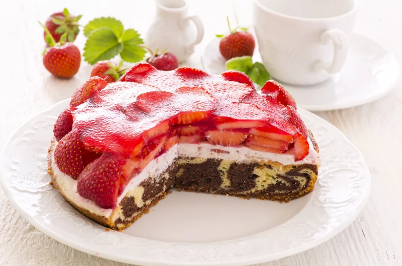 Wierzch: Truskawki umyj i oczyść z szypułek. Podziel je na 2 równe części. Jedną z nich zblenduj na gładką masę. Dodaj sok z cytryny. Do szklanki przelej ok. 4 łyżki przygotowanego musu. Dodaj skrobię i dobrze wymieszaj, by nie było grudek. Pozostały mus truskawkowy zagotuj z dodatkiem cukru, a następnie dodaj mieszankę skrobiową. Powoli doprowadź do wrzenia, cały czas mieszając. Zdejmij z ognia i ostudź.
