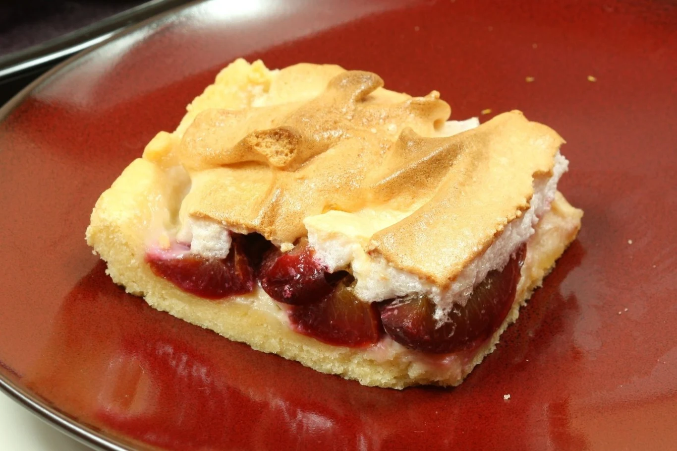 Na podpieczony spód wyłóż śliwki, rozkładając je równomiernie. Na nich rozprowadź ubite białka i piecz dalej w niższej temperaturze 170 stopni Celsjusza przez około 30 minut. Schłódź przed podaniem.