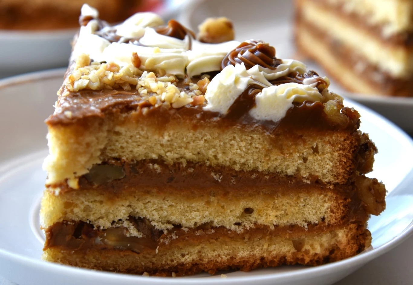 Każdy blat przełóż przygotowanym kremem. Na wierzchu rozprowadź bitą śmietanę i posyp całość orzechami.