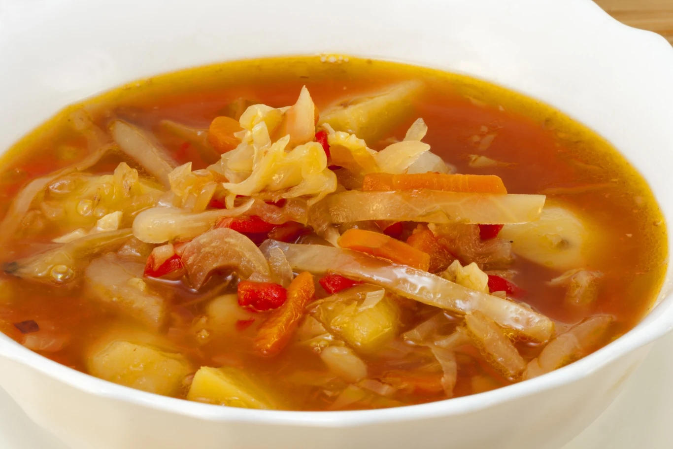 Następnie dodaj pomidory, ziemniaki, kapustę oraz bulion. Doprowadź wszystko do wrzenia, a potem zmniejsz ogień do małego i gotuj całość przez 35-40 minut, do miękkości warzyw. Dopraw kapuściankę do smaku. Dobrze wymieszaj. Zupę podawaj na gorąco. Resztki przechowuj w szczelnym pojemniku w lodówce i spożyj w ciągu 5 dni.