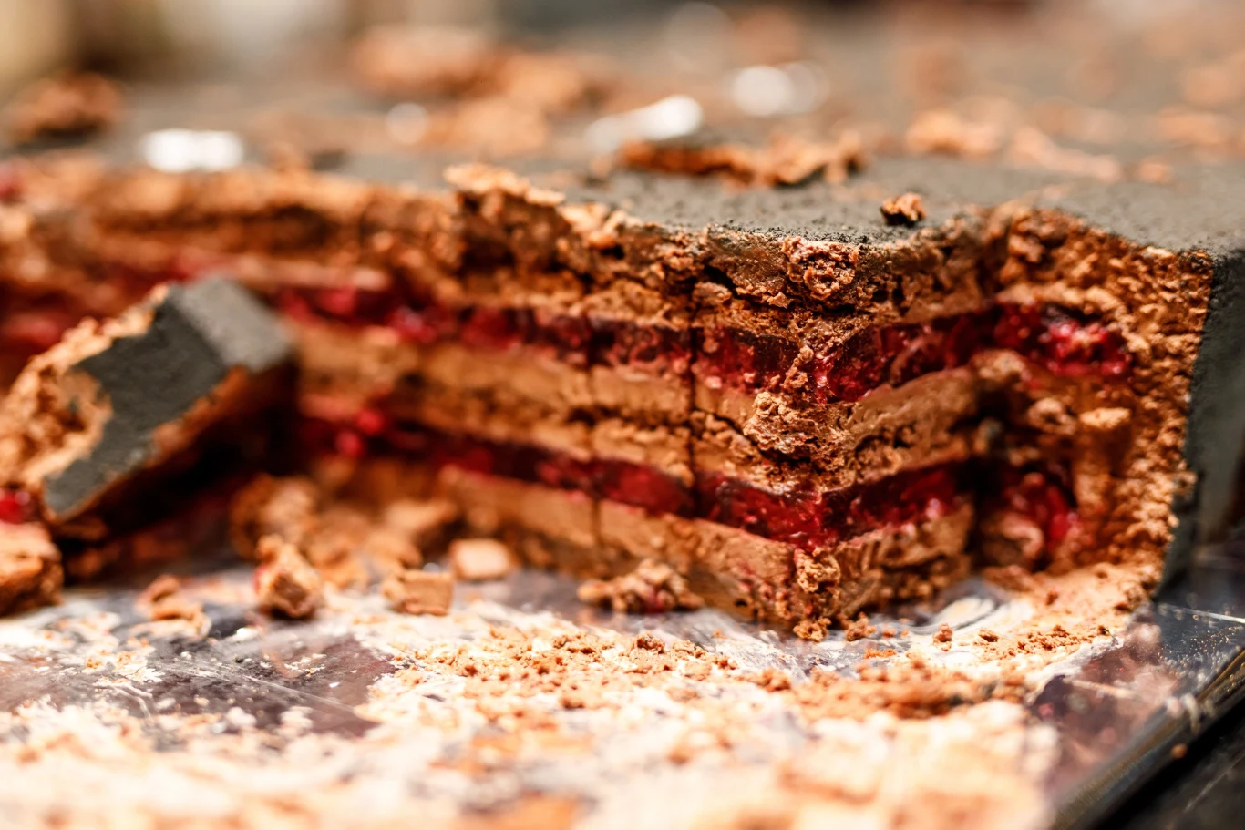 Przełóż kremem blaty ciasta ułożone na przemian z blatami galaretki. Wierzchnią warstwę także posmaruj cienko kremem i oprósz kakao. Wstaw na co najmniej kilka godzin do lodówki.