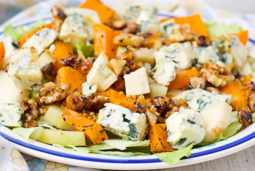 Sałatka z dynią i serem pleśniowym to doskonale prezentująca się jesienna sałatka, która idealnie łączy słodycz gruszki i dyni z ostrym smakiem sera pleśniowego. Chrupiące orzechy dodatkowo podkręcają smak tego dania. Bardzo chętnie jem ją na kolację albo biorę do pracy.