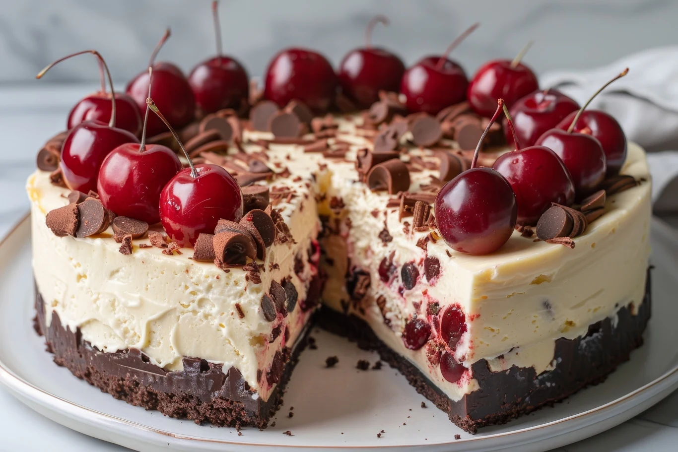 Sernik z wiśniami i czekoladą wstaw do lodówki na co najmniej 3 godziny. Udekoruj świeżymi wiśniami i płatkami czekoladowymi.