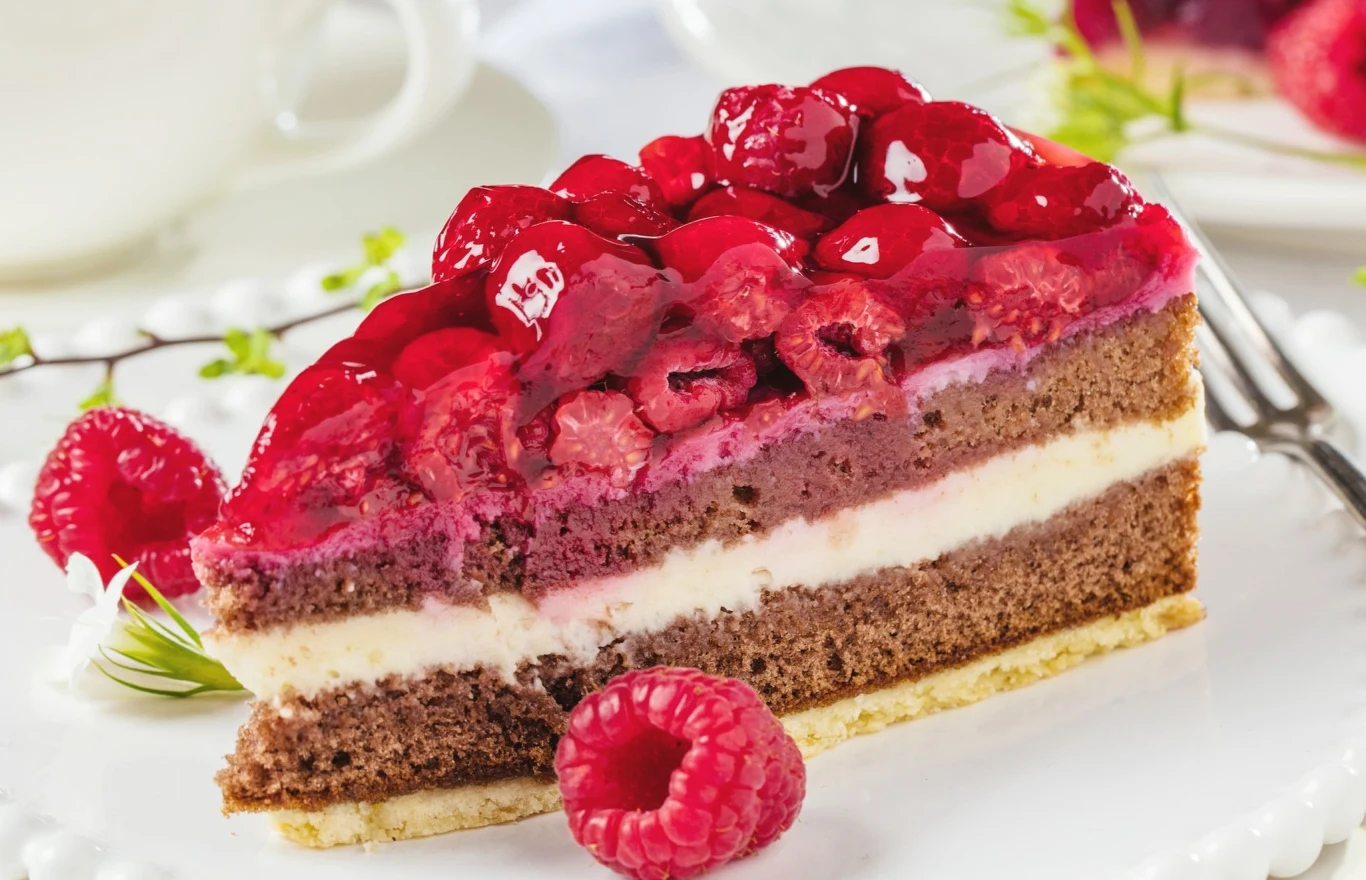Na wierzchu rozsmaruj równomiernie pozostały krem i połóż frużelinę malinową.