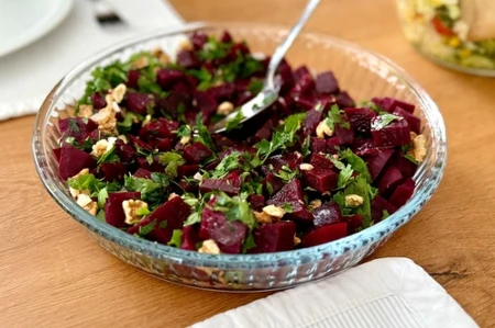 Ta sałatka z gotowanych buraków to prawdziwa uczta dla podniebienia i zmysłów. Aromatyczne buraki oraz chrupiące, lekko słodkie orzechy włoskie stanowią idealne połączenie, które dopełnia wyrazisty dressing. To świetna propozycja na zdrowy lunch lub kolację - spróbuj i przekonaj się, jak wyjątkowe może być klasyczne danie w nowej odsłonie.
