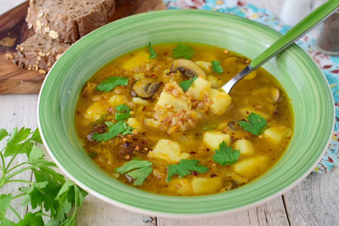 Zupa z kaszą gryczaną to prawdziwie rozgrzewająca, sycąca i aromatyczna zupa z warzyw i kaszy, dzięki czemu zaspokoi nawet duży głód. Używając bulionu warzywnego, możesz z powodzeniem podać ją nawet osobom na diecie wegańskiej. Danie jest łatwe i szybkie, ale też niesamowicie treściwe. Nawiązuje do regionalnej kuchni kresów wschodnich, gdzie wykorzystywano proste i tanie składniki, które w połączeniu ze sobą dawały niesamowity efekt. Nic nie stoi na przeszkodzie, żebyś dodał też marchewkę, pora czy seler, jeśli masz je w lodówce. W tej zupie zakochają się wszyscy domownicy i goście.
