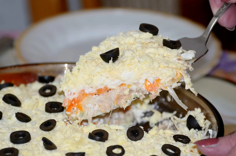 W przezroczystej salaterce lub misce warstwowo ułóż składniki w następującej kolejności: połowa porcji tartego sera, cebula, tuńczyk, sos, żółtka, marchewka, białka jajek, odrobina soli i druga część tartego sera.