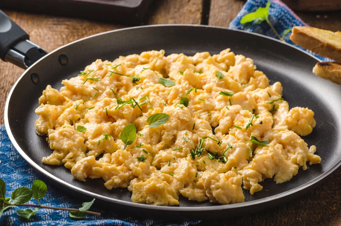- W miseczce roztrzep jajka z odrobiną soli i pieprzu, po czym wlej na patelnię. Mieszaj powoli, na małym ogniu, aż jajecznica osiągnie pożądaną konsystencję - kremową lub bardziej ściętą, jak wolisz.