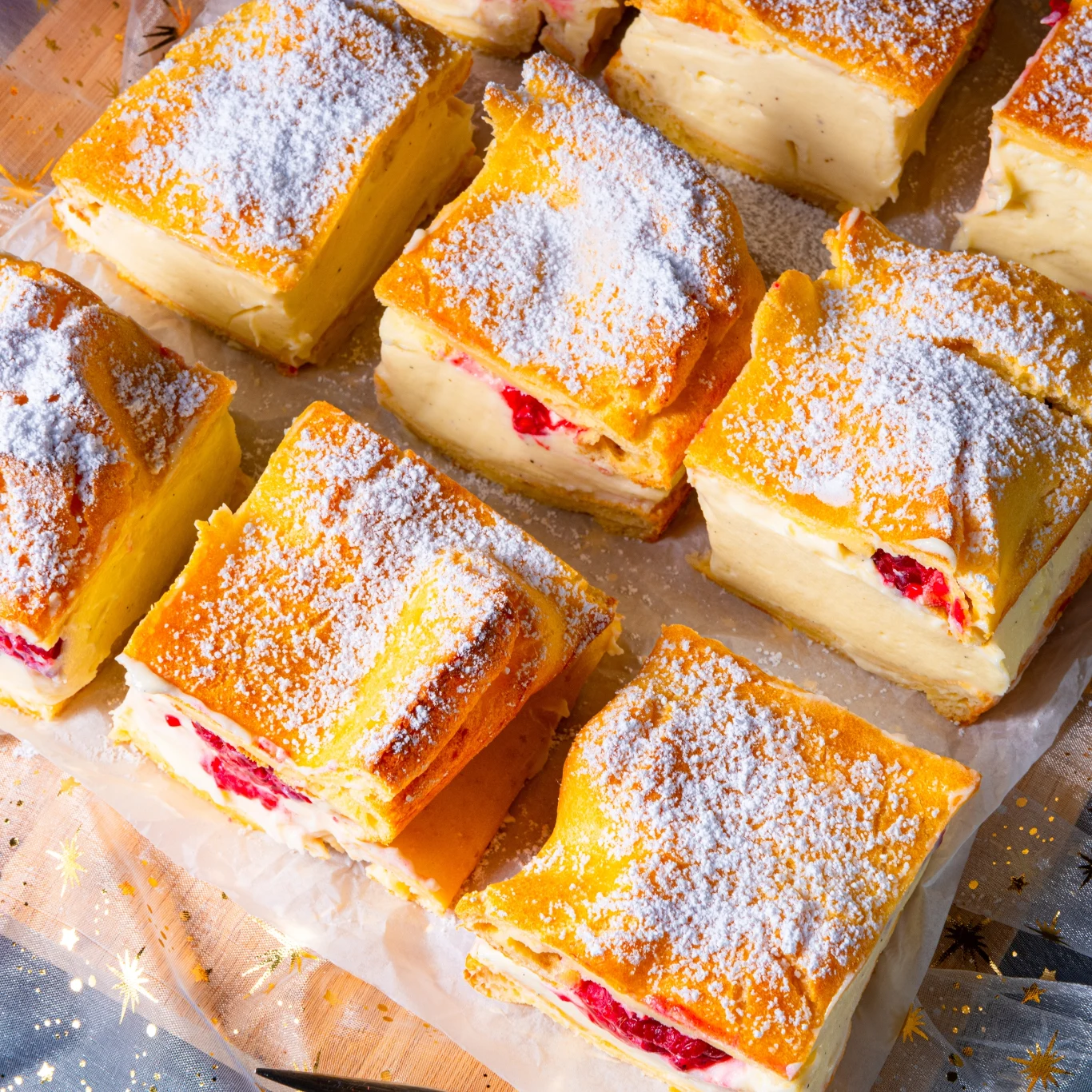 Gotową karpatkę z malinami możemy opcjonalnie posypać cukrem pudrem lub startą czekoladą. Te delikatne, waniliowe ciasto z pewnością zasmakuje twoim gościom!