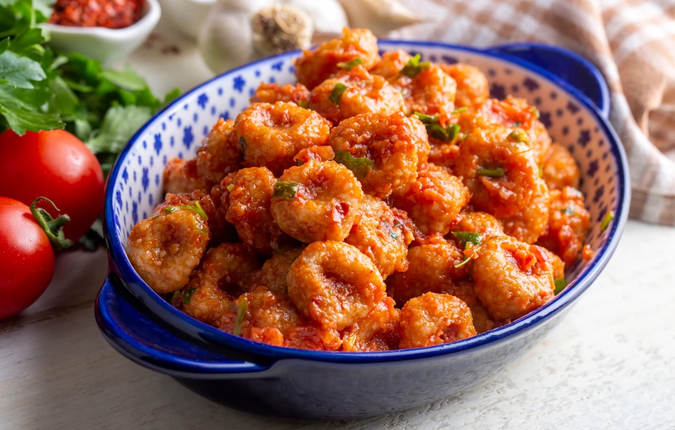 Dopraw ciasto do smaku solą. Na podsypanej mąką stolnicy uformuj z niego wałek o średnicy około 2,5 cm. Podziel go na 2-3 cm odcinki. Utocz z ciasta kulki i w każdej zrób palcem niewielkie wgłębienie (w ten sposób "złapią" więcej sosu).