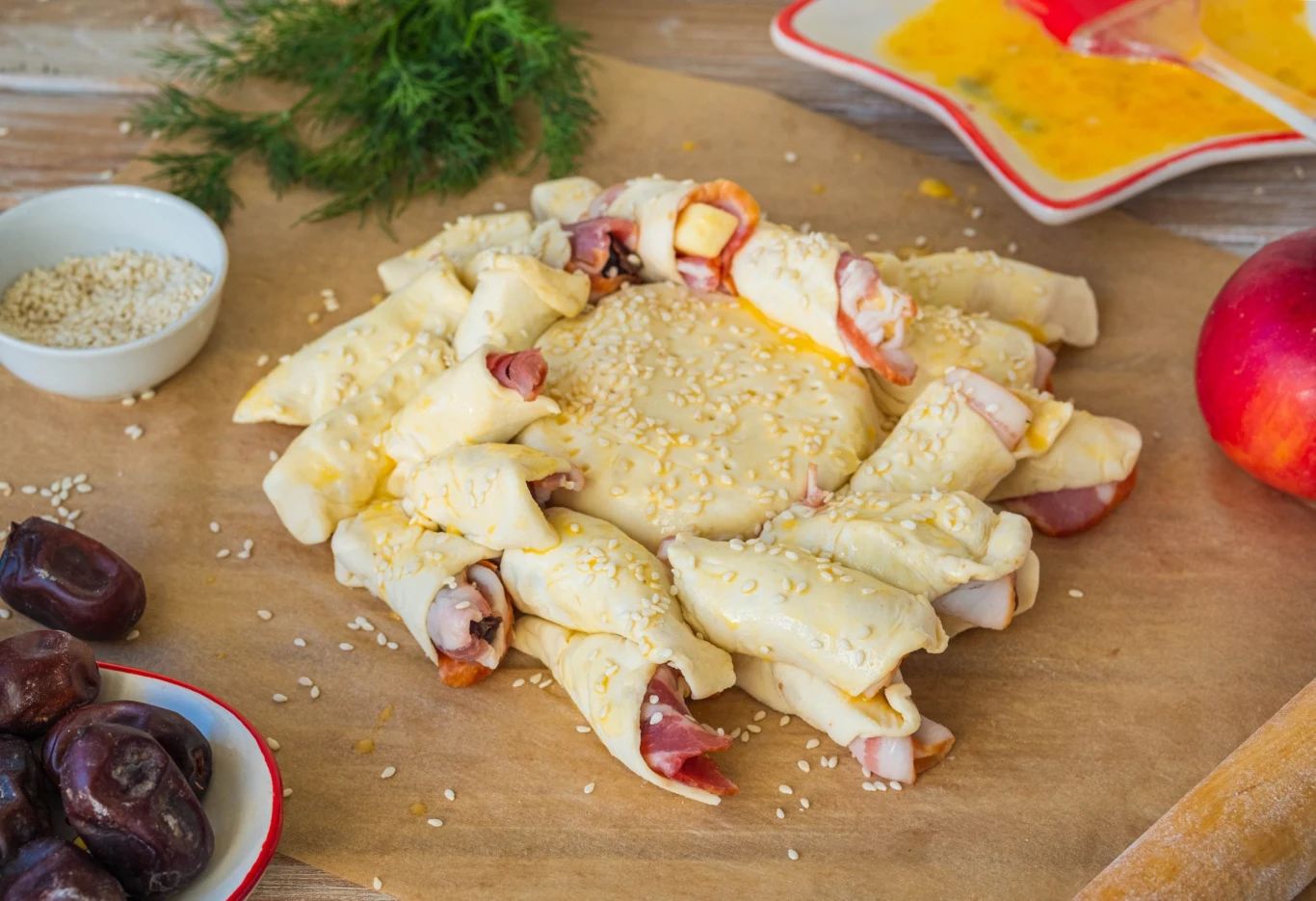 Przykryj drugim arkuszem ciasta tak, aby w pełni zakryć całość. Obetnij końce drugiego ciasta - uważaj, krawędzie pierwszego i drugiego ciasta muszą się ze sobą stykać. Następnie wytnij ok.2,5-3 cm paski ciasta, zaczynając od krawędzi sera, aż do końca ciasta. Staraj się to robić tak, aby w każdej wyciętej części był jeden daktyl i fragment jabłka. Wykonaj wycięcia dookoła sera, aby stworzyć promienisty wzór. Wycięte paski skręć w spirale, a górę całej przekąski posmaruj roztrzepanym jajkiem i posyp ziarnami sezamu.