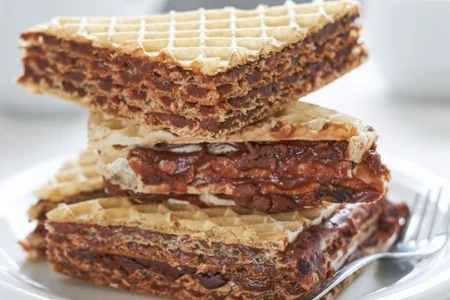 3. Wyjmij pierwszego wafla i ułóż na talerzu lub paterze. Rozsmaruj na nim ostrożnie (nożem lub łyżką) wystudzoną masę. Zrób to dość cienko i koniecznie równomiernie (zostaw też ok. pół centymetra marginesów od brzegu, aby masa się nie wylała). Dociśnij kolejny wafel i ponownie przełóż kremem. Układaj kolejne warstwy, aż do ostatniego wafla (na górze nie rozprowadzaj kremu).