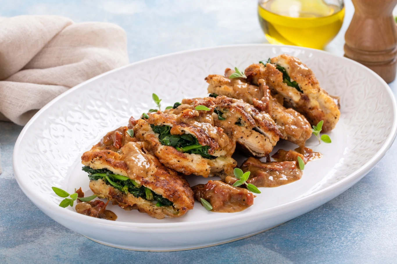 Kurczak nadziewany szpinakiem to jednocześnie prosty w przygotowaniu, a przy okazji elegancki obiad. Możesz go podać na uroczystym spotkaniu rodzinnym czy podczas świąt albo przyrządzić na codzienne danie główne. Przepis wcale nie jest skomplikowany, za to połączenie smaków - wyborne. Mięso drobiowe jest lekkostrawne i niskokaloryczne, a szpinak - pełen witamin, minerałów i antyoksydantów. Wspaniałego aromatu i jeszcze większej soczystości dodają potrawie suszone pomidory.