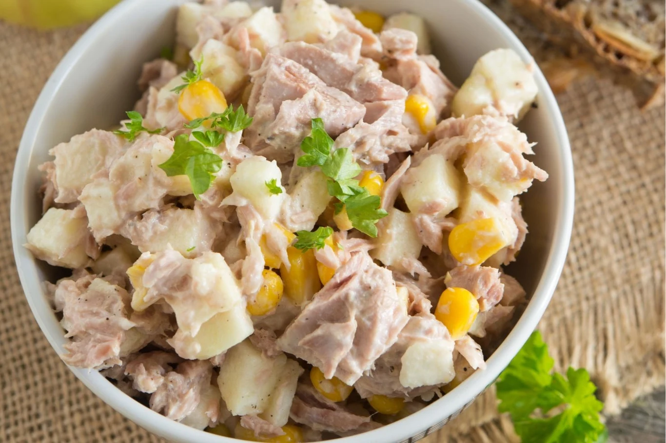 Odsącz tuńczyka i kukurydzę z zalewy. Lekko rozdrobnij tuńczyka. Połącz w misce z kukurydzą i jajkiem.