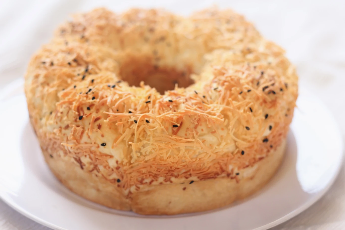 Formę z kominem o średnicy 20 cm wysmaruj masłem i posyp bułką tartą. Przenieś ciasto do blachy i posyp wierzch tartym serem. Wstaw całość do piekarnika nastawionego na 165 st. Celsjusza i piecz przez 25 minut lub do czystego patyczka.