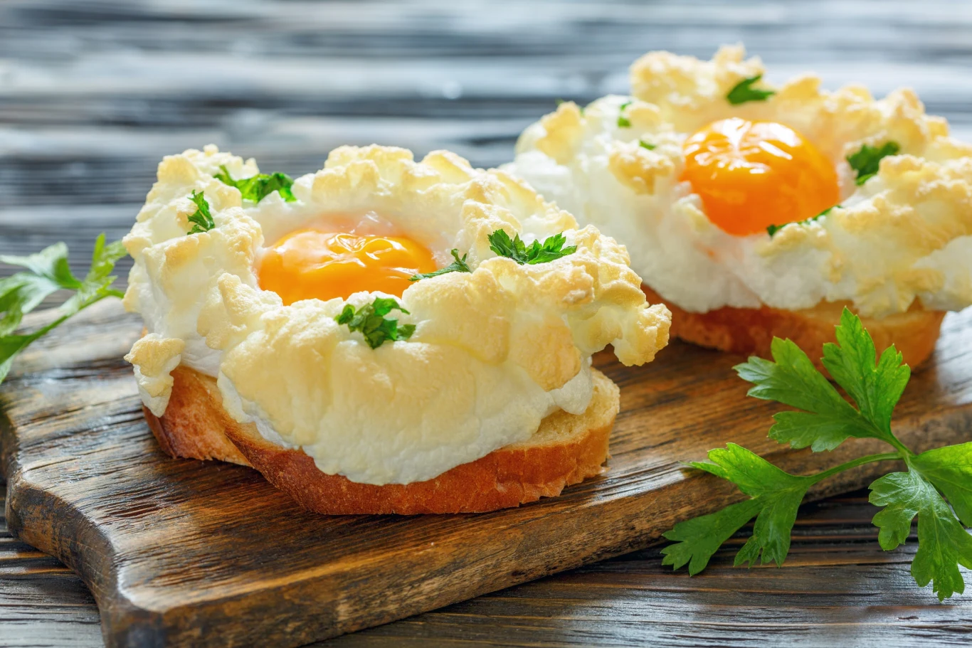 Kromki chleba połóż na talerzu, a następnie połóż po 2 plasterki boczku. Na wierzchu umieść po chmurce jajecznej.