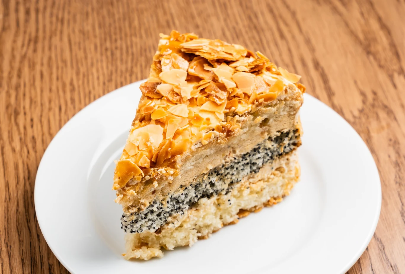 Zrób najpierw biszkopt. Oddziel białka od żółtek. Ubij z solą na sztywną pianę. Stopniowo dodawaj cukier, a następnie po jednym żółtku, nadal ubijając. Mąkę wymieszaj z proszkiem do pieczenia i delikatnie wmieszaj w masę jajeczną. Ciasto wylej do formy wyłożonej papierem do pieczenia (ok. 25 × 35 cm). Piecz w temperaturze 170°C przez 30-40 minut aż biszkopt będzie lekko złoty. Po wystudzeniu ostrożnie oddziel od papieru i odłóż na bok. Zrób teraz ciasto makowo-kokosowe. Białka ubij na sztywną pianę z odrobiną soli. Stopniowo dodawaj cukier, ciągle ubijając aż masa stanie się błyszcząca. Dodaj mak, wiórki kokosowe oraz mąkę wymieszaną z proszkiem do pieczenia i mąką ziemniaczaną. Delikatnie wymieszaj szpatułką. Wylej ciasto na blaszkę tej samej wielkości co biszkopt. Piecz w temperaturze 170°C przez 30-40 minut. Odstaw do wystygnięcia. Teraz zrób krem. Masło utrzyj na puszystą masę. W osobnej misce ubij jajka z cukrem na parze (do momentu, aż masa stanie się gęsta i jasna). Zdejmij z ognia, lekko przestudź i połącz z utartym masłem. Dodaj kakao rozrobione z odrobiną gorącej wody. Całość dokładnie wymieszaj aż powstanie gładki, aksamitny krem. Na spód ułóż biszkopt. Posmaruj cienką warstwą kremu, aby warstwy dobrze się połączyły. Połóż ciasto makowo-kokosowe i lekko dociśnij. Rozprowadź równomiernie pozostałą część kremu. Posyp obficie prażonymi płatkami migdałów.