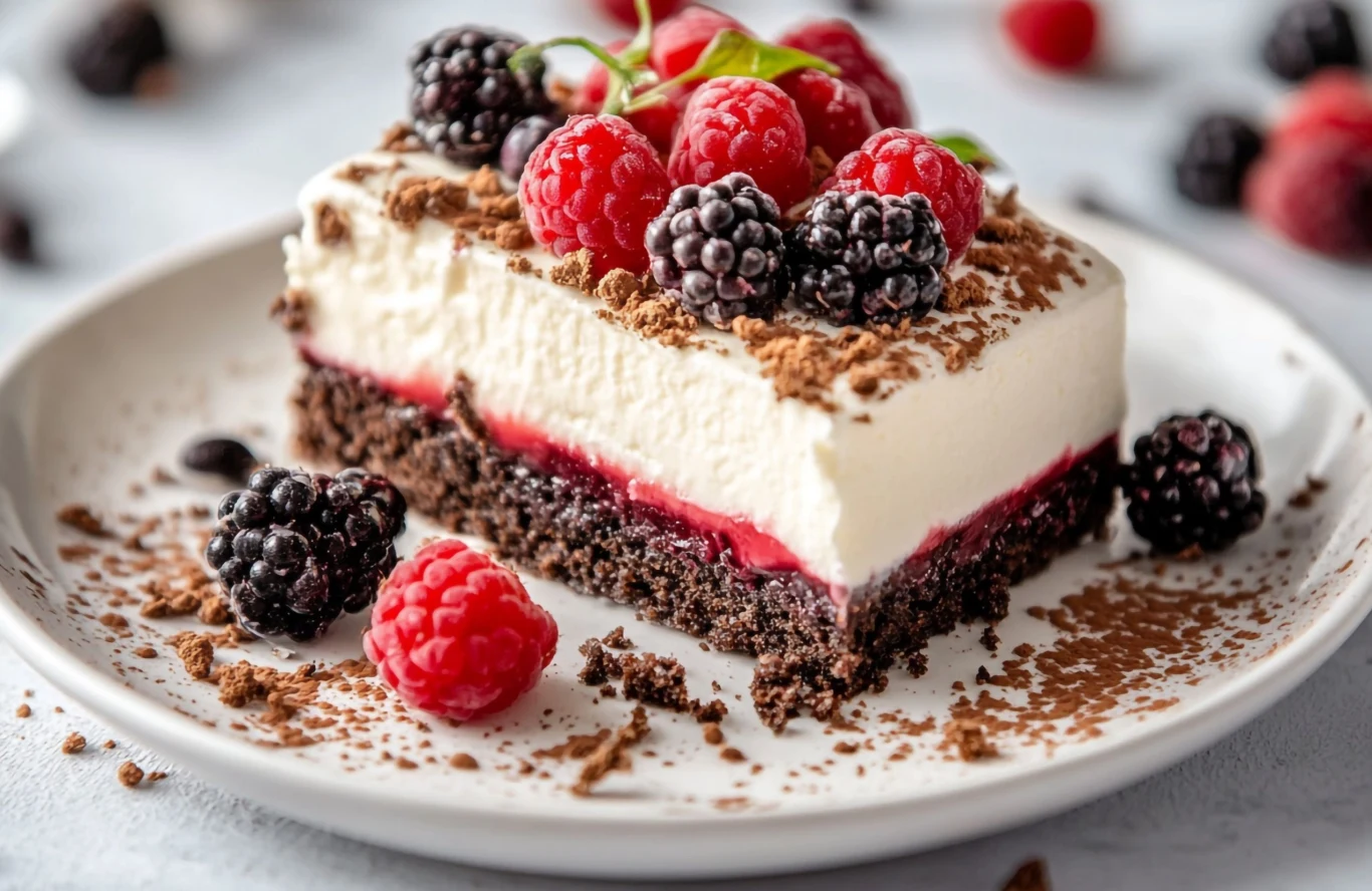 Na wystudzone ciasto wyłóż frużelinę, krem ze śmietanki i mascarpone. Wierzch posyp startą czekoladą, udekoruj malinami i jeżynami. Gotowe.