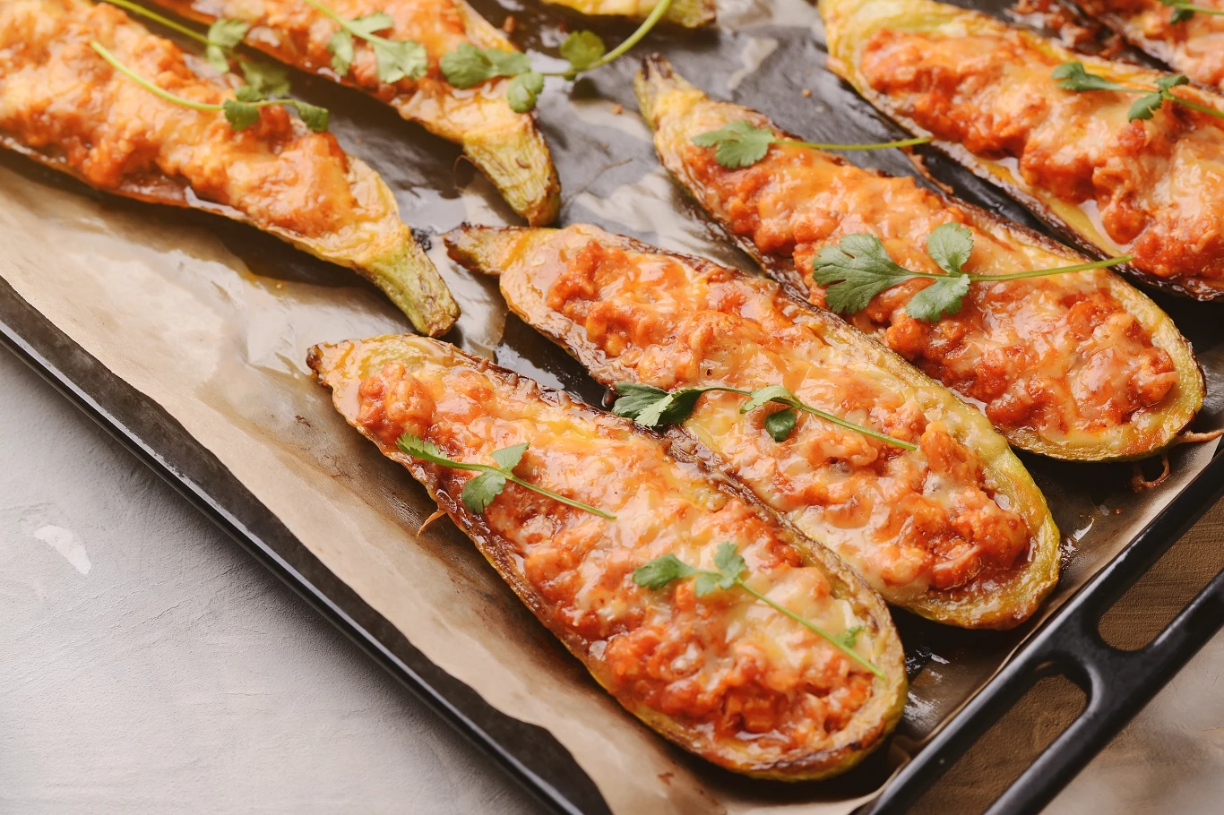 6. Upieczoną nadziewaną cukinię wyciągnij z piekarnika i oprósz posiekanym koperkiem. Podawaj ją na ciepło, od razu po przyrządzeniu.
